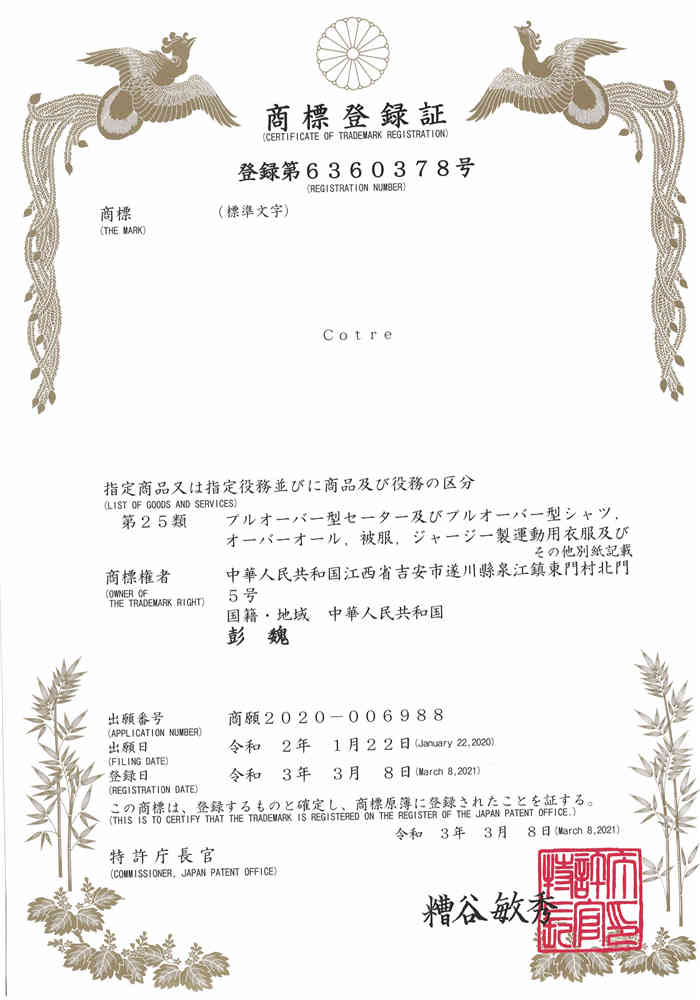 日本商標(biāo)-COTRE-25類-服裝鞋帽
